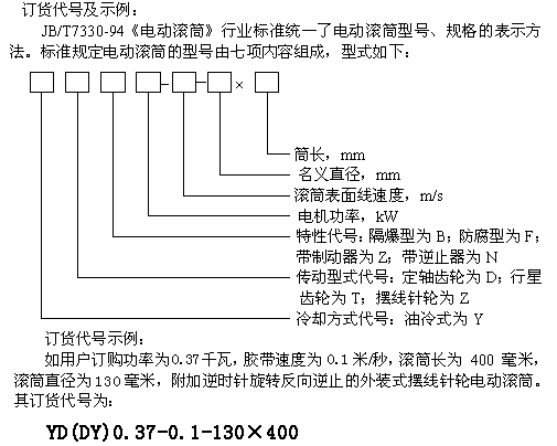 (2)用戶訂購逆止電動滾筒時,須注明旋轉方向,如不注明則為任意方向。其表示方法為在特性代號后加“S”(表示在電機引出線一側觀察,端蓋應順時針旋轉)或“N”(表示在電機引出線一側觀察,端蓋應逆時針旋轉)。